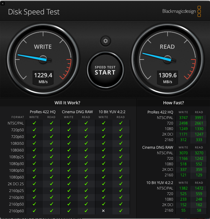 Consistently hitting 2,500mb/s write and 2,400 read speeds in Blackmagic tests.