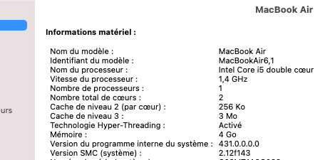 The first is a Macbook air 7,2 13p and has a boot rom version of 427 : I took his Apple SSD and re-installed Big Sur with the sintech + NVME drive, TimeMachine etc.. all is working on it, no fan noise, no sleep problems, no high temperature, the NVME gives me 1460 mb/sec in speedtest read, about 1100 in write. Are those numbers good ? It seems that the MBA is more responsive.