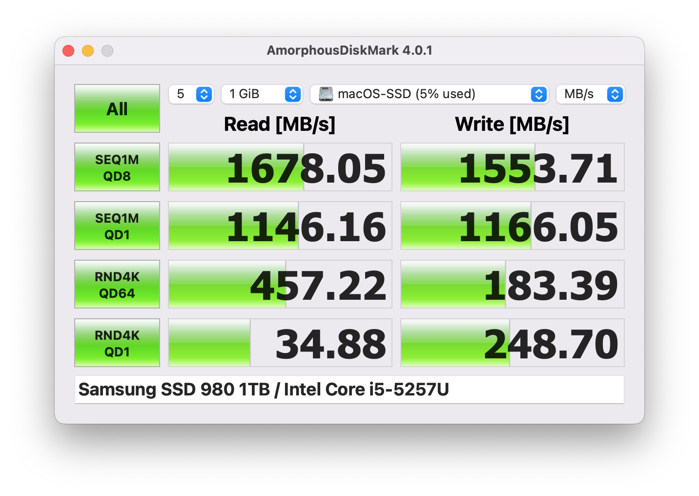 Attached is the AmorphousDiskMark readout which looks better than Blackmagic, but clearly not as good as what you showed me. DriveDX wouldn't run on it and had a note saying S.M.A.R.T on Aura wasn't supported. No idea how to (or if I can) enable trim.