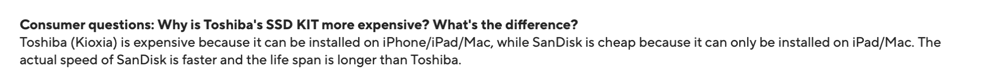 They are not telling you the whole truth. Yes Toshiba's NAND is slightly more expensive, but it is also quite a bit thinner than SanDisk's physically from what I observed (potentially one of the reasons why it is also used in iPhones).