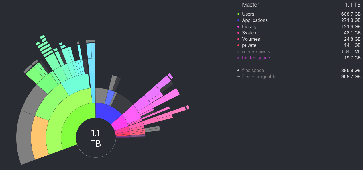 The Users space is obviously the largest, and contains a 225GB Parallels file, 123GBs in my Photos Library, 80GBs in Lightroom files (they can't be stored off Mac), and a whooping 145GB in the Library...