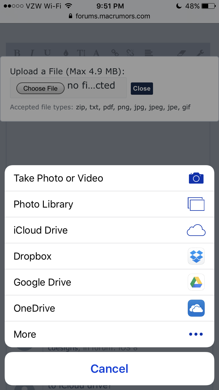 This has struck me as a major limitation with Safari on iOS for some time but I'm wondering if there are any workarounds or other browsers in which it's possible to upload non-picture files to web forms.