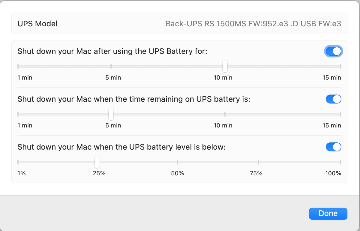 ^^^^Do you release that the batteries in UPSs are replaceable? In a Mac you really do not need extra software, the OS recognizes the UPS and allows control over it, as shown in Post #2.