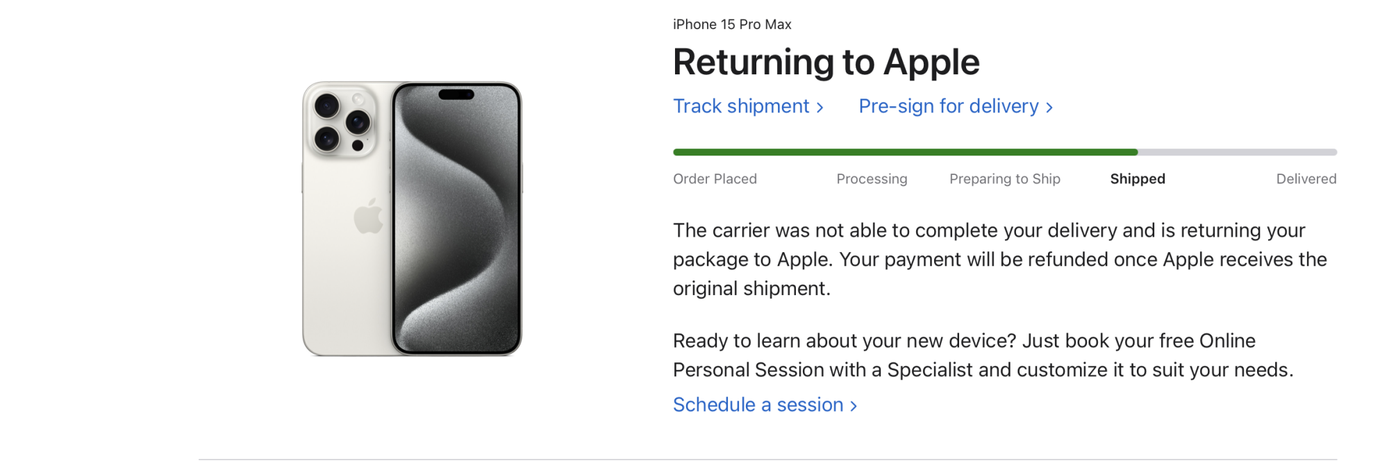 UPS could not complete the delivery???? Apple will refund me the money. I just paid out all this and did the loan stuff with Citizens. This is crazy. I'm at work so I can t stay on the phone with apple. I have t wait until I get home.