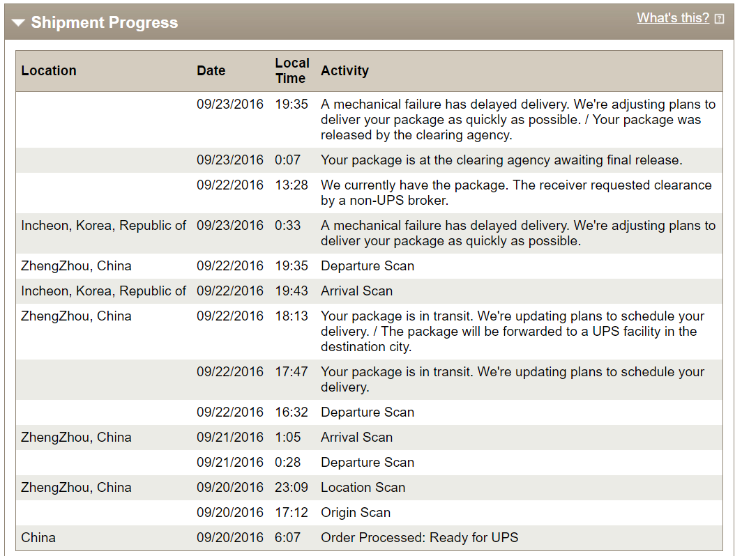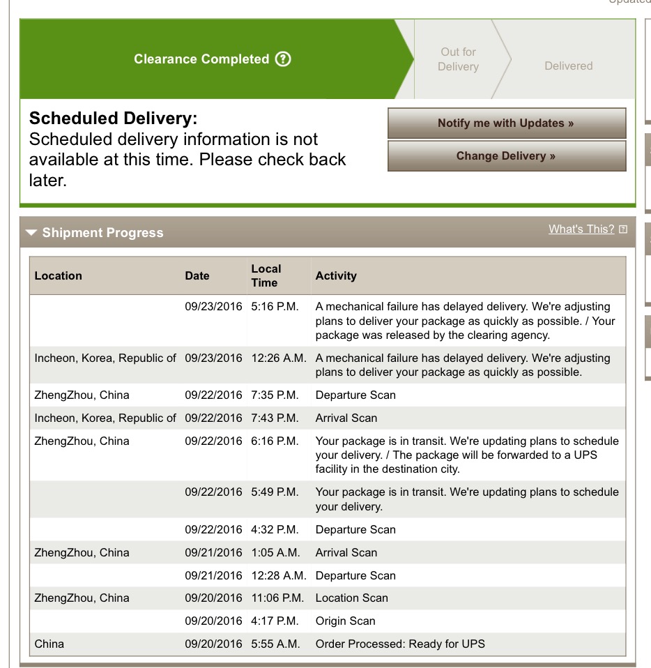 I too am one of those "Incheon, Korea, Republic of 09/23/2016 4:25 A.M. A mechanical failure has delayed delivery. We're adjusting plans to deliver your package as quickly as possible." people. Originally supposed to (per UPS) get my delivery yesterday, then today, now "Scheduled delivery information is not available at this time. Please check back later."