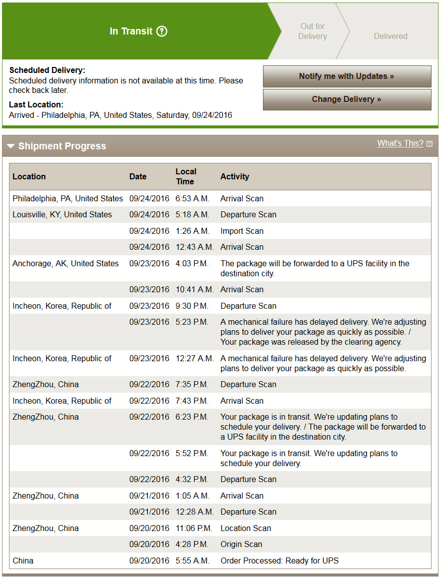 09/21/2016 4:08 P.M. Your package is in transit. We're updating plans to schedule your delivery. / The package will be forwarded to a UPS facility in the destination city.