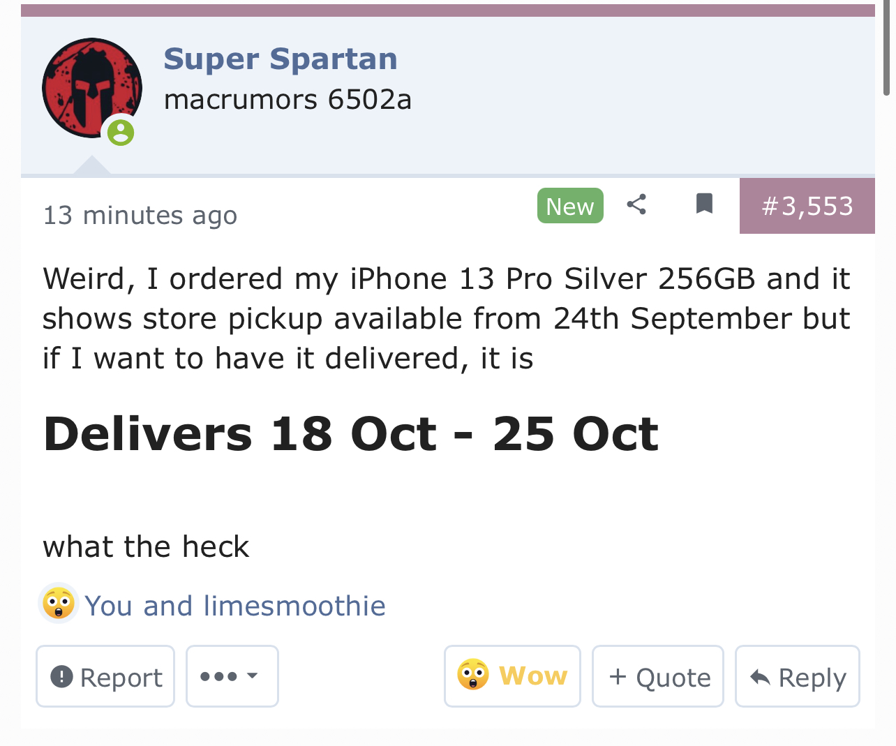 That is correct! Actually, in Los Angeles, I can still pick up option available in my hometown Glendale, but the delivery is moved to October. I guess the new iPhone 13 is not selling well this year as expected.Someone posted this in the UK thread. Good lord have mercy!!! 🙏
