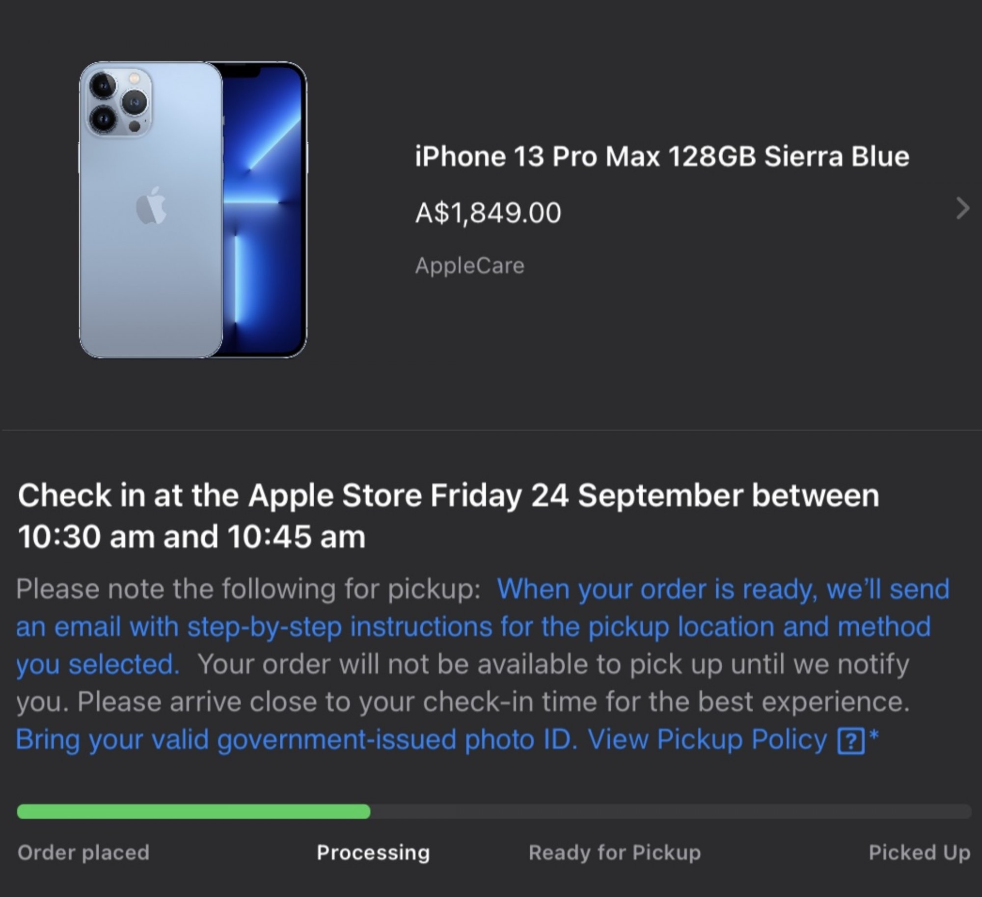 I pre-ordered the iPhone 13 PM Graphite 256GB; it is set to arrive on 09/24. I did the "get ready for preorder" on the web on Wednesday. I set it for 24/mo no interest on Apple Card (not the IPU). Apple immediately authorized the cost of the iPhone and AppleCare+ and listed it on my Apple Card as an installment plan. They did a separate authorization for taxes. They said if I deleted the transaction or didn't complete the preorder by 09/20 they would release the hold on my Apple Card account. I accessed the store via the app around 4:55 AM (PDT) today and it let me in to complete the pre-order around 5:04 AM (PDT). When I went back in today all I had to do was review and confirm. I didn't do the IPU because I have never kept an iPhone less than 2 years and I pass my old phone to my wife and her phone goes to another member of her family (currently an iPhone 8 Plus). She will be getting my iPhone 11 PM 256GB. If I offer to buy her a new phone she says she prefers just taking my old phone and saving the money. So, it works out well for everyone.