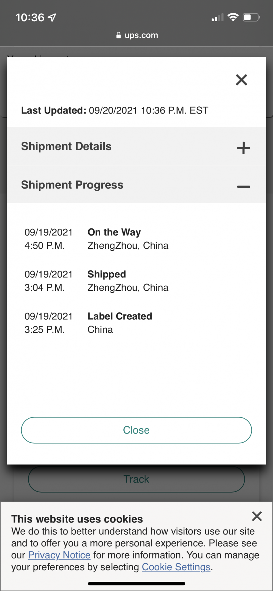 | 09/20/2021 12:30 P.M. | Shipped ZhengZhou, China |