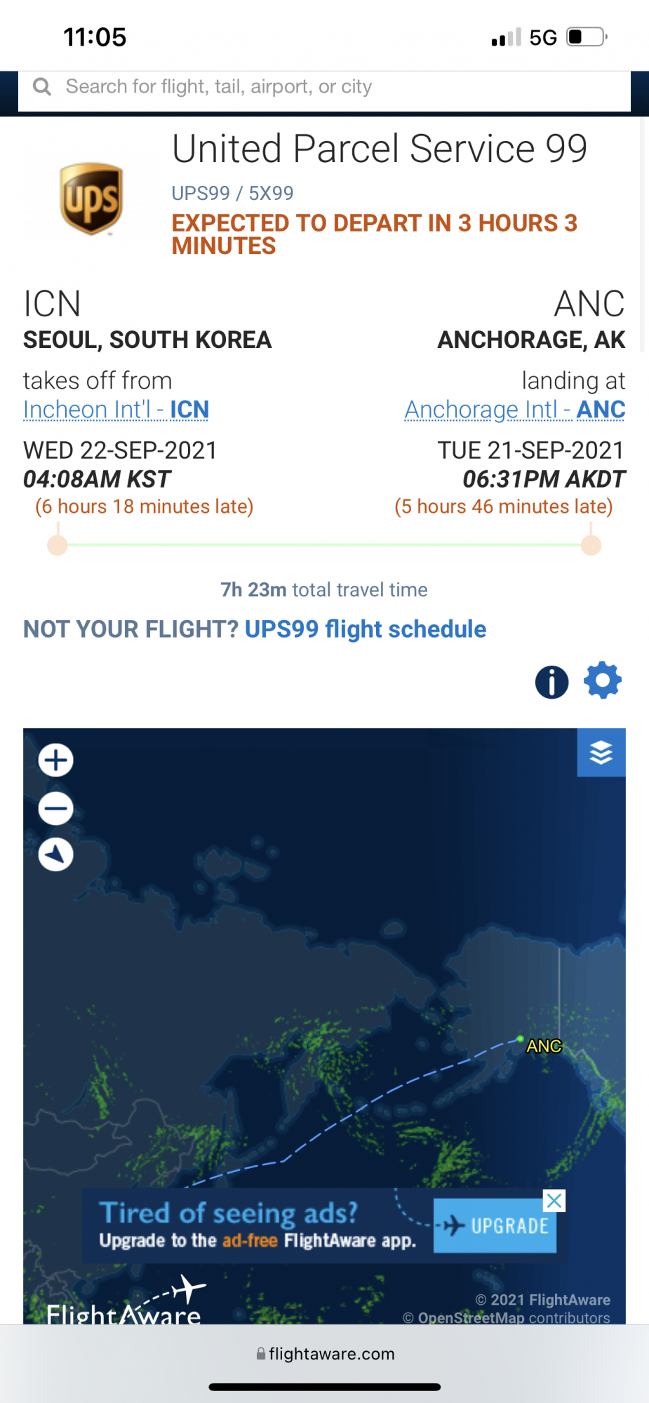 Wait so there is now a UPS99A taking off at 3:53am KST (2:53pm EST 9/21). I wonder if that's the flight we'll be on? I wonder what happened to UPS99? It still says delayed for some reason. Oh well!!