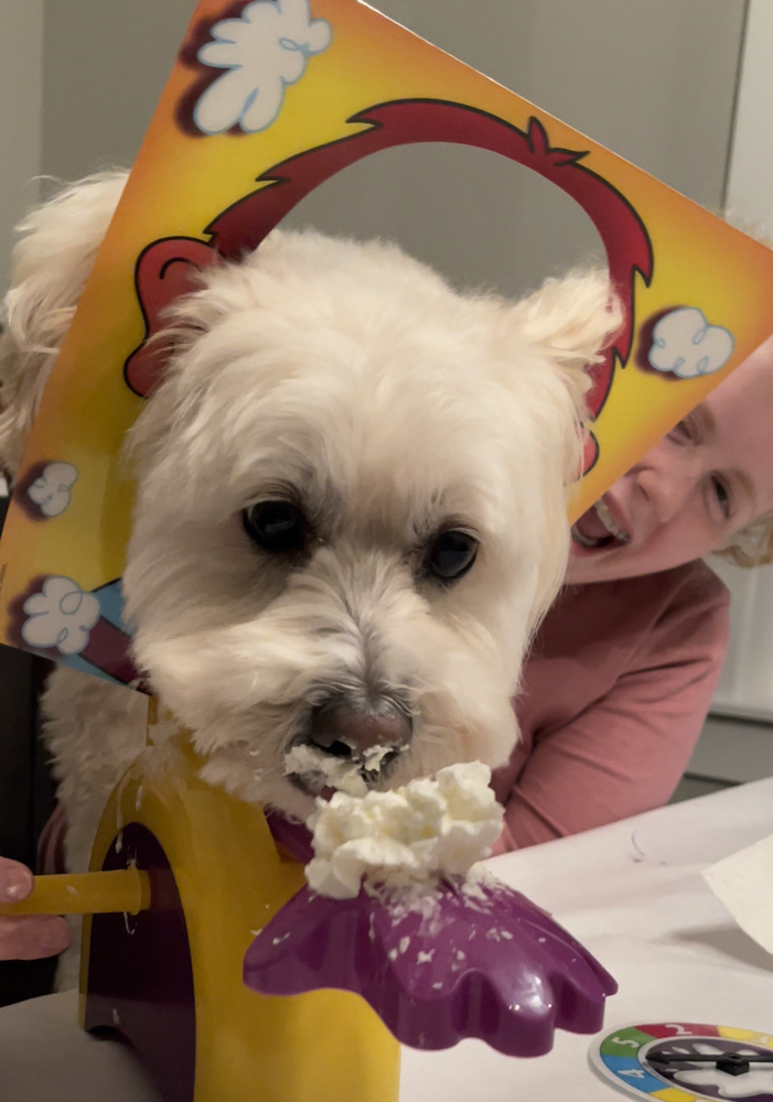 Too cute! My Timber waves a paw. He’s 16.5 and still going strong. ❤️Yes, and half poodle (we think). Here he is winning at a game of PieFace for family game night.