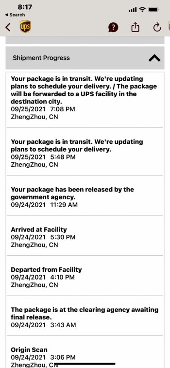 I got an update from UPS a little after midnight that my package had cleared customs and had been cleared by a government agency. Other than that, I had no clear idea now if my phone was in Louisville or ZhengZhou.