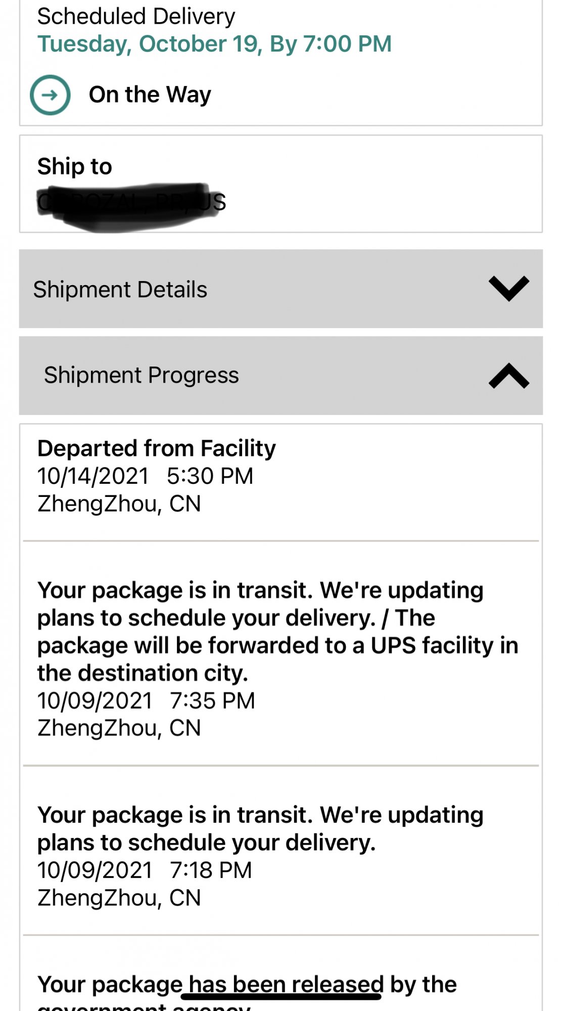 Same here. Finally saw movement this morning. Along with the updated delivery date. Now to see where the next leg of the journey will be and how long it will take to get there.UPS just change my estimated delivery to oct 19 and still in china