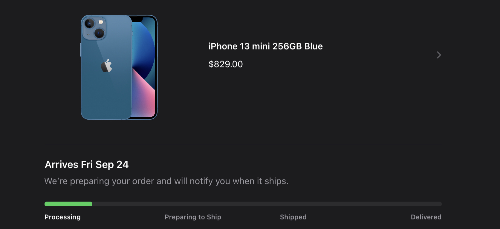 The iPhone 13, iPhone 13 mini, and iPhone 13 Pro remain available for delivery on September 24. In China, the iPhone 13 and iPhone 13 mini will still be delivered on that date, but the iPhone 13 Pro has already slipped back to between two and three weeks.