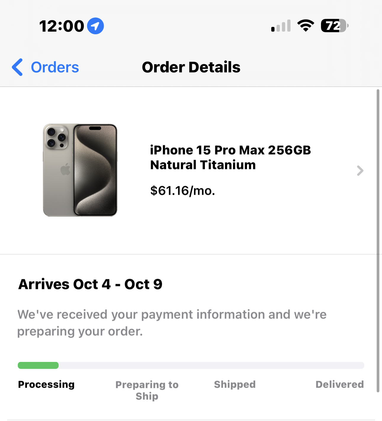 Mines still on “order placed” as well but im not too worried. I did get an email being approved for iup from citizens. Im hoping soon.First time ordering on Apple. For store pickup, how soon does it switch to processing? Just curious as mine still hasn’t. 8am 9/22 pickup