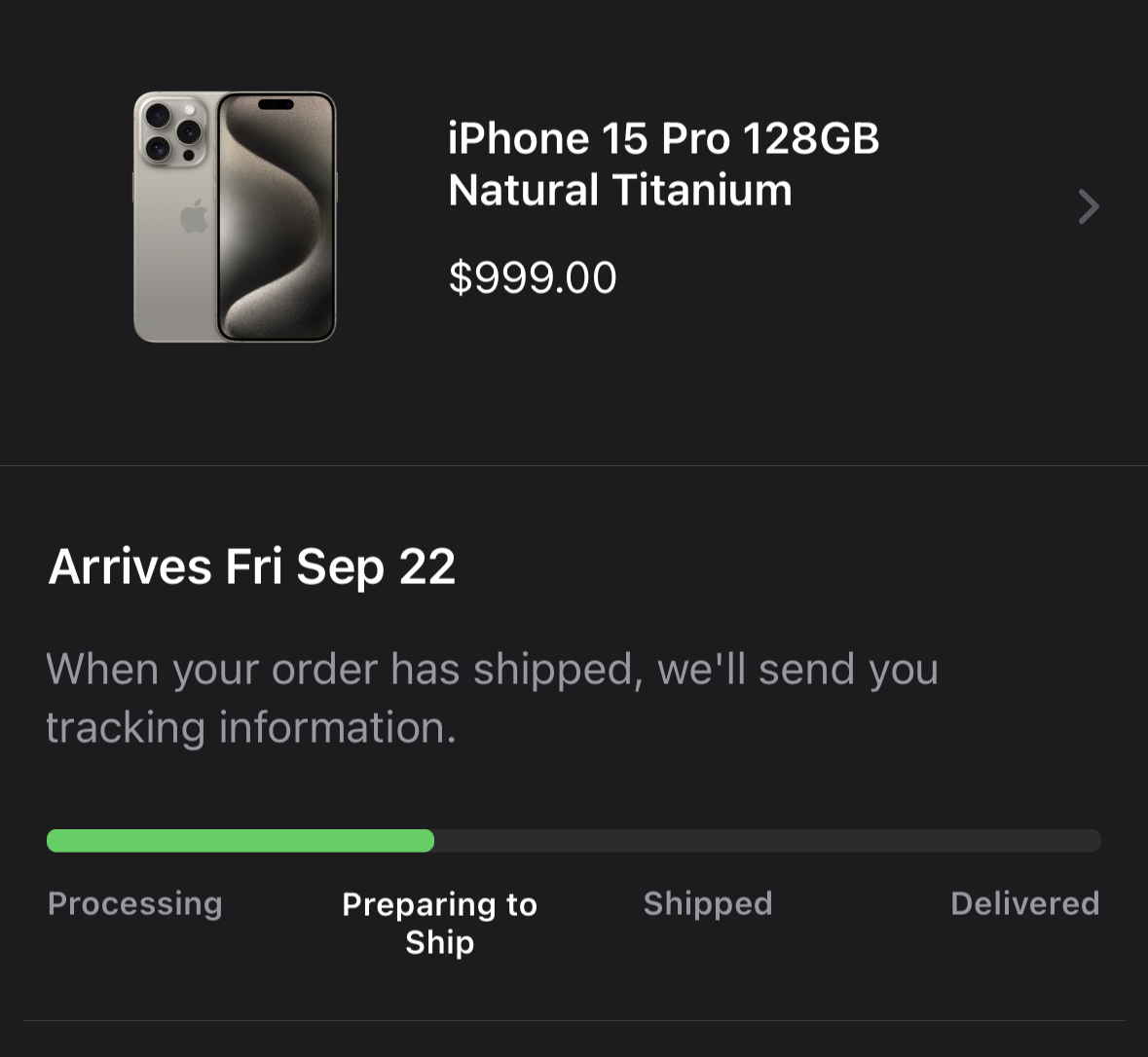 It looks fine and says Preparing to ship. I have looked in deleted, both on my PC, phone and Ipad, the email from Apple just disappeared?? My card was charged a little after 6amThat's strange. Maybe you deleted it? What does your Apple Order History say?
