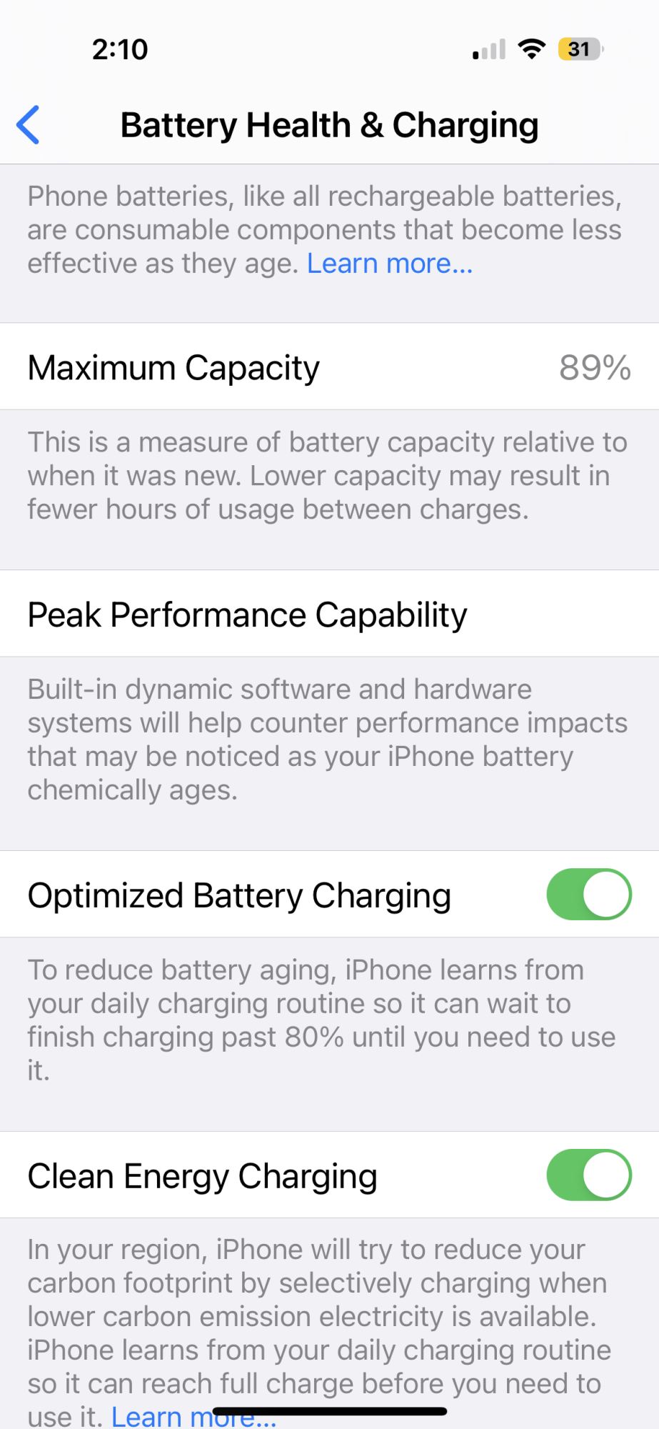 I got my 14Pro on launch day, too. Deep Purple has not been good to me. I’m at 31 right now and I went out to lunch, walked the dog, did some stuff around the house-it hasn’t all been sitting on my booty, refreshing this thread!My 14 Pro Max 1TB was delivered a year ago on launch day and—today—my battery health is 96%. I use it every day. It rarely gets below 75% charge during the day. I also have it set to "Optimized Battery Charging". I put it on my wireless charger every night before I go to sleep.