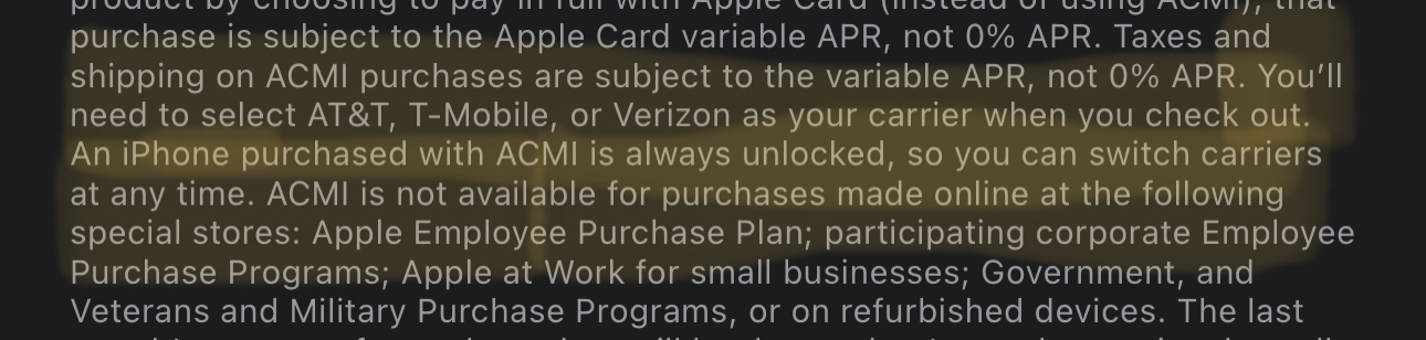 Though keep in mind that some carriers will lock out your phone so you would need to run some errands with customer service to prove that you still outright own the phone(even though on 0apr cc) to be let go.@swarlos The iPhone will be unlocked when you purchase with ACMI financing regardless of what carrier you select. View attachment 2260457