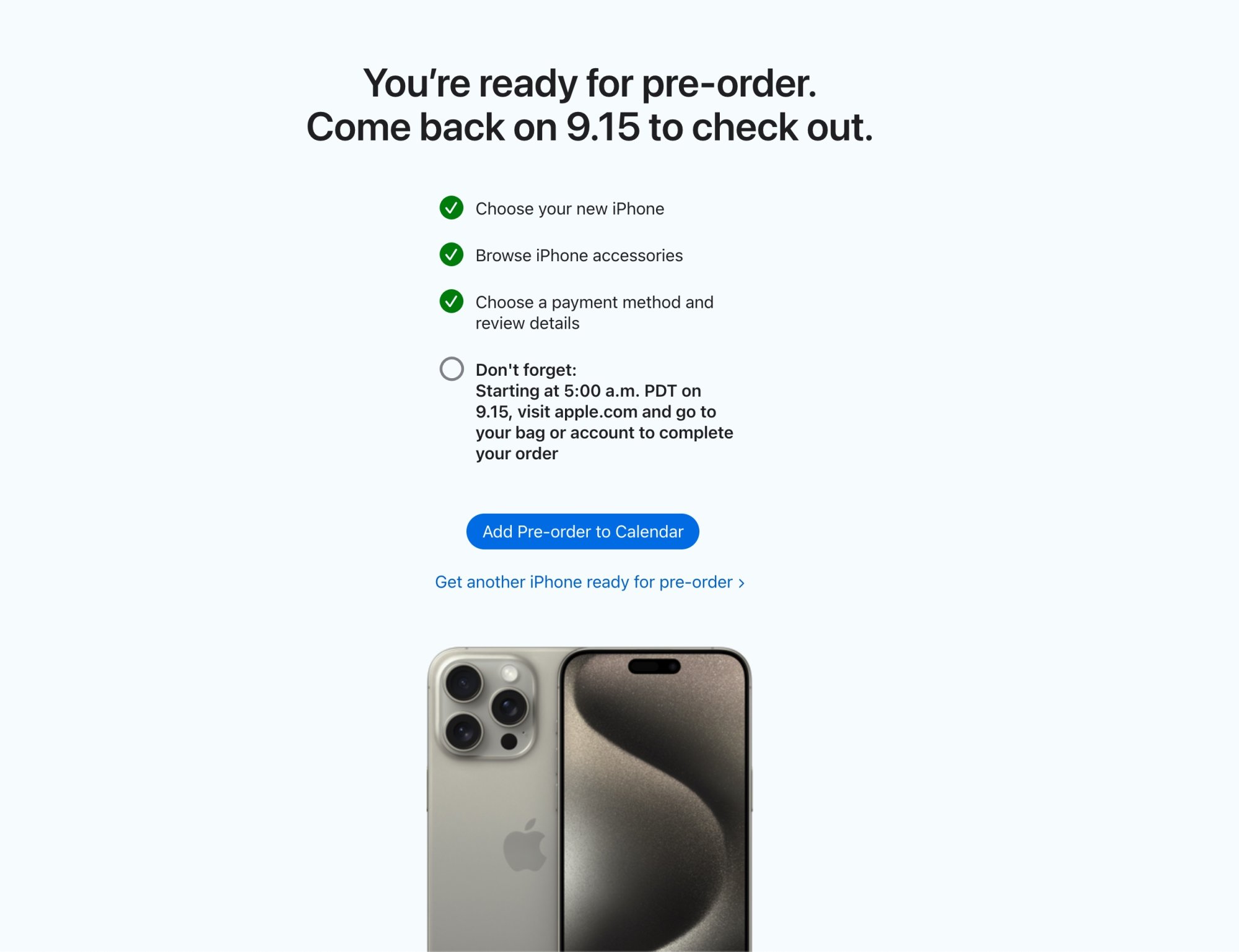 Natural Titanium 15 Pro Max is pre-ordered, Carrier confirmed, Apple Card approved, ready to finalize Friday 8am EST.