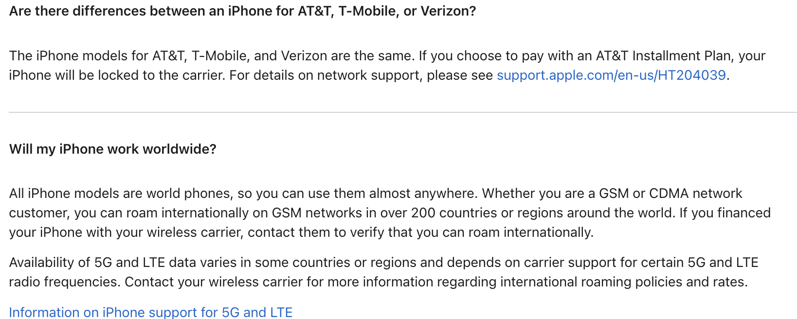 iPhone - Supported 5G and LTE networks