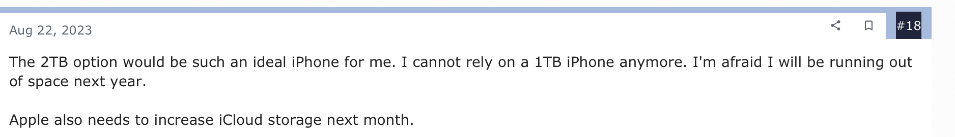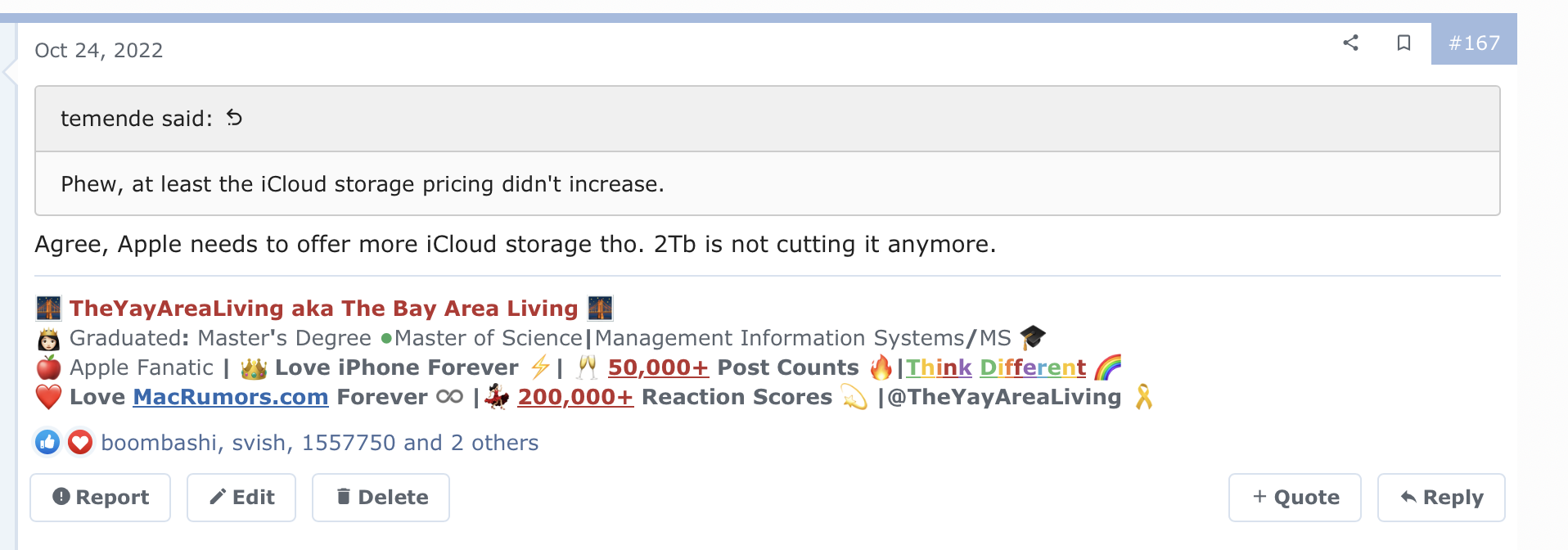 My 2 TB fam plan is full. I added an additional 2 TB for $10/mo on top of One. More storage will only be an increasing need as time marches on. Said another way, we’re not going to be needing less storage in the future. 🤪Agreed! I begged Apple for almost 3 years to increase the Apple iCloud+ storage. I begged them at every opportunity I got in here. Finally, Apple listened. Proof below. Check out the time stamp.