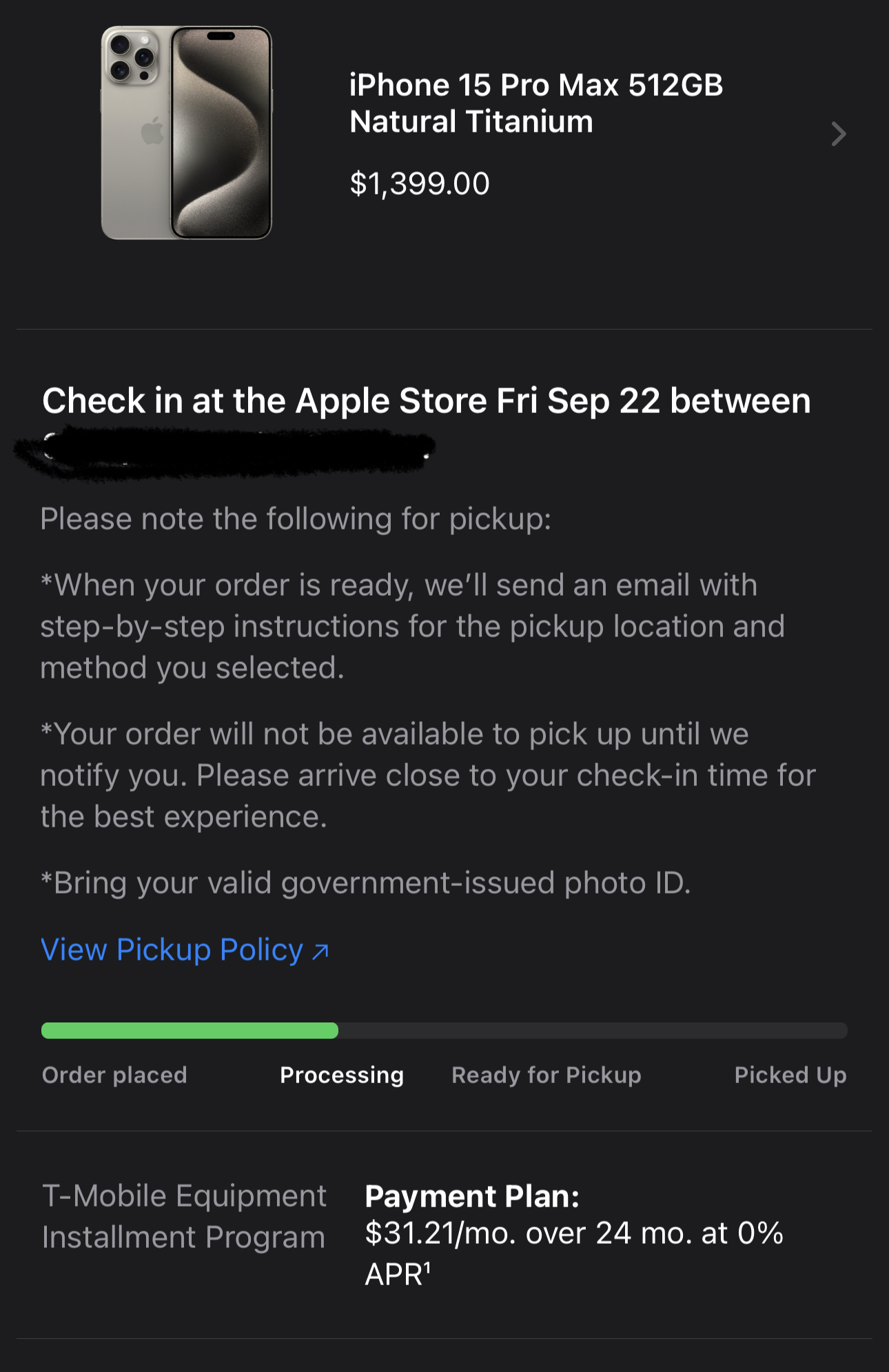 I went back a bunch of pages, and I was glad to read that I wasn’t the only one who had significant issues with preordering this year. The store opened up at 5:05 or 5:06 AM, but it took fighting with it until 5:20 AM to be able to access my saved pre-pre-order. The Apple Store application was completely useless, I ended up being able to push through on Safari on the iPhone and complete the order at 5:21 AM. I have an iPhone 15 Pro in Natural Titanium with 128GB of storage, much to my surprise, to be delivered on the 22nd. The 13 Pro and 14 Pro preorder process was WAY easier… My word. Something has to change for next year, this was an absolute mess!