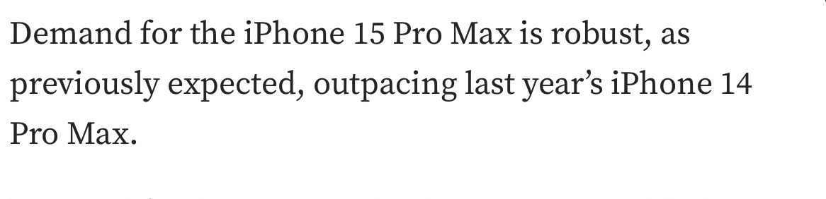 I kind of regret not getting the Pro Max. Go big or go home lol. I may have to try it next year for sure. I’m seeing where the White Titanium isn’t really white white more silvery maybe. That’s kind of disappointing. When I made my decision I thought it was pretty white.Check out the latest Phone 15 Thoughts on the iPhone 15 first weekend pre-order. Released 2 minutes ago by Supply Clain Expert. Mr. Kuo.