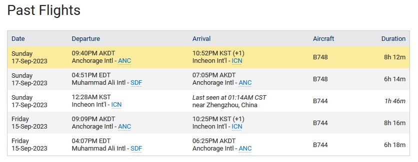 Our aircraft is currently in Seoul fueling up and swapping crew for the way over to Zhengzhou (CGO). The aircraft is N611UP, a 2018 Boeing 747-8. The flight time enroute today should be 1:45.