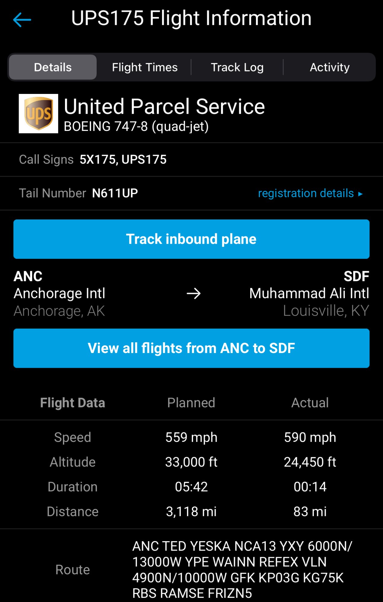 UPS 175 should depart to (SDF) in about 45 minutes from (ANK) on the way to (SDF) UPS Worldport in Louisville, TN.