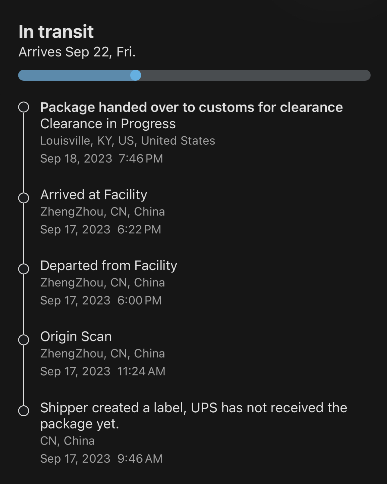 Don’t rely on AfterShip App. It’s in China. Wait for @FlightLevel310 briefing to be made in the morning.I can’t explain this. As of this morning, UPS shows it still in China, AfterShip shows it in KY