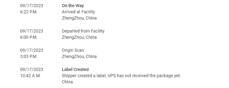| 9/17/2023 11:42 AM | Label Created Shipper created a label, UPS has not received the package yet. China Mainland |