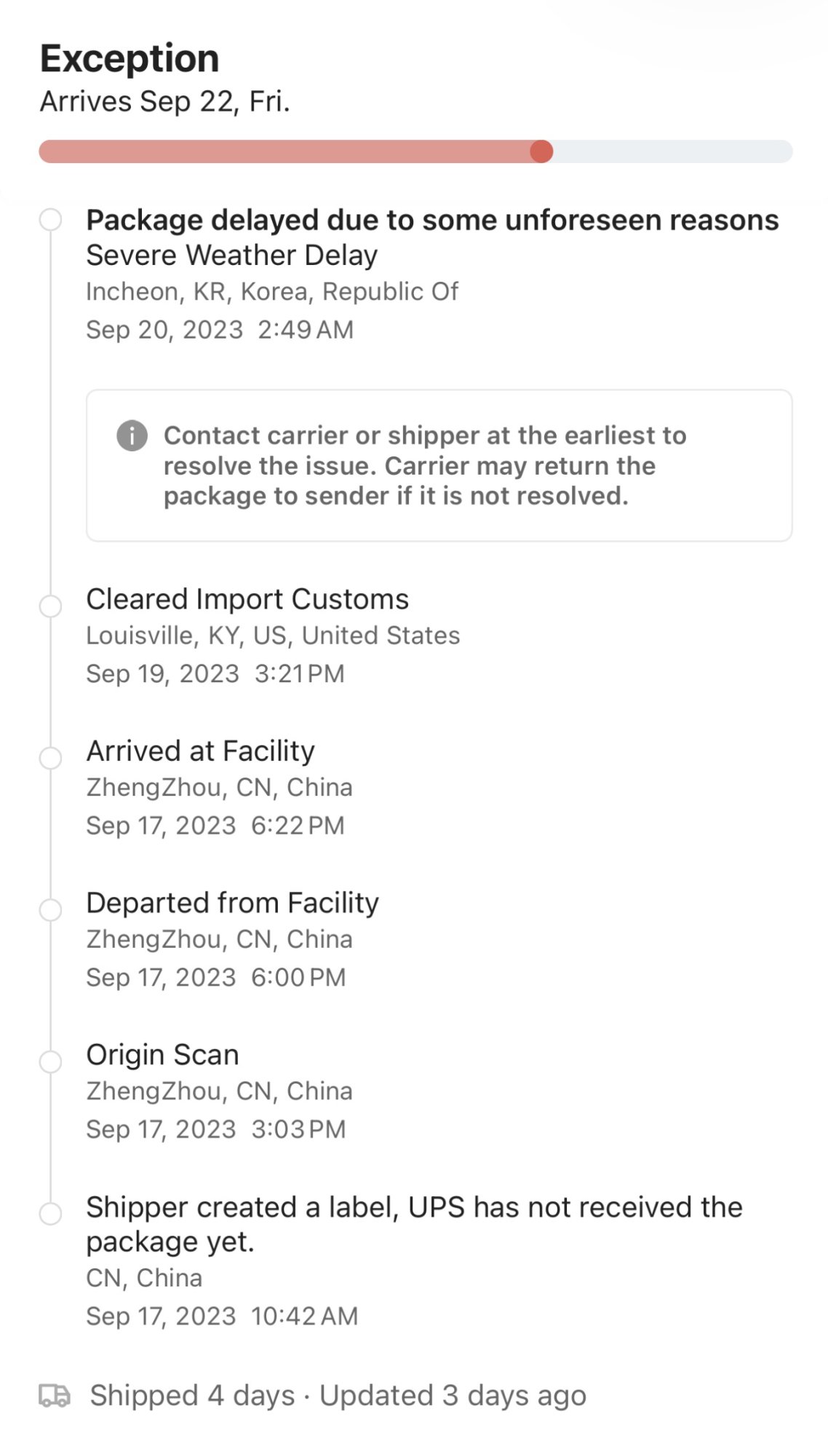 Mines the sameSo here is the update. As of now, UPS My Choice is still showing 6:22pm in ZZ. I decided to download Aftership and it's showing I cleared Customs in Louisville yesterday and today delayed due to weather in Incheon.