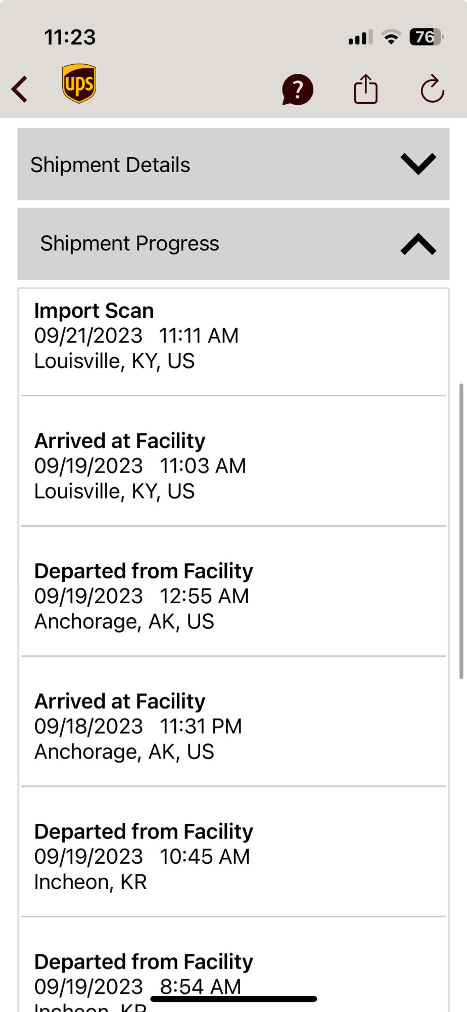 Mine (PM Natural) and my wife's (Pro Black) were on the same flights all the way to KY. Mine has import scan of 8:59am and hers doesn't have one yet. It must be on a different pallet.... at the bottom..... :cool: