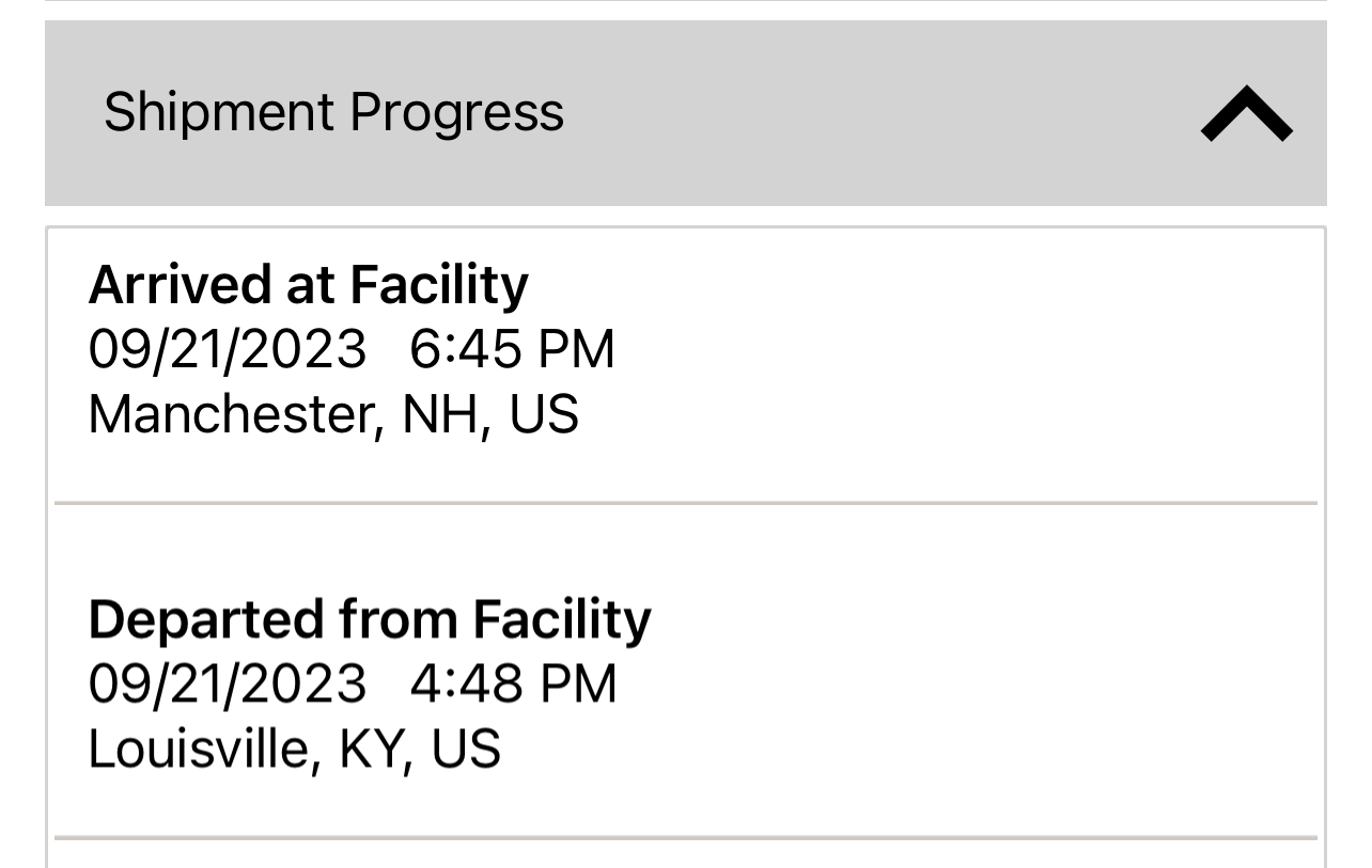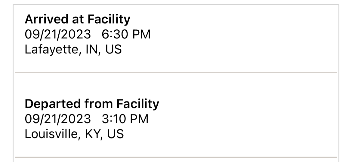 | 9/21/2023 03:43 PM | Departed from Facility Louisville, KY, United States |