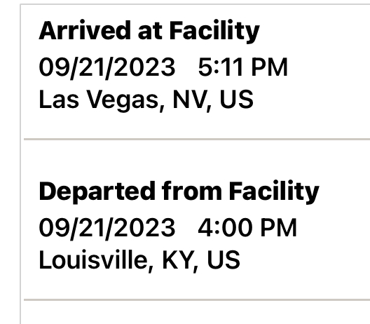 | 9/21/2023 03:43 PM | Departed from Facility Louisville, KY, United States |