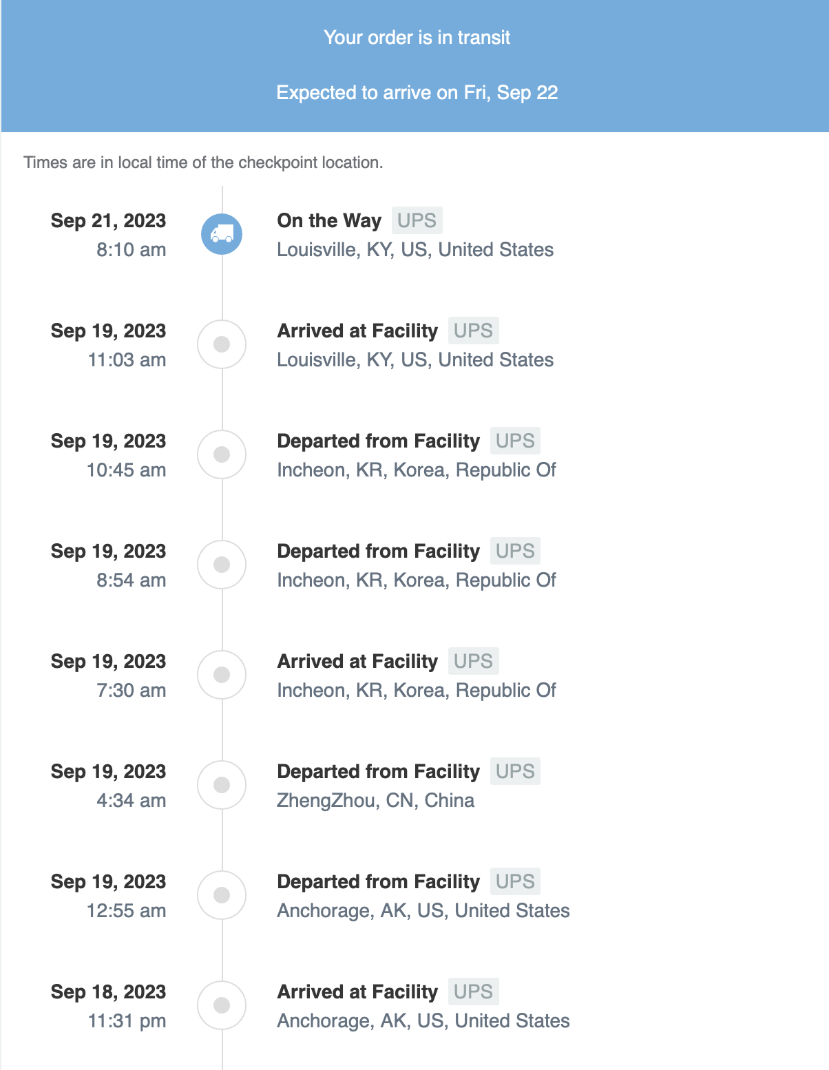 yes, this is Aftership. My MyChoice is trash - it's a mess between telling me my pw is locked and then not accepting the change - so I can't post a screenshot from that - but normal tracking - just has that last entry - on the way at 8:10. That's the normal UPS tracking entry - the dumbed down secure version.Is this the Aftership app? My Aftership app looks like this on there, just saying "On the Way". My screenshot is from UPS MyChoice. Even in AfterShip, though, I'm seeing the same times and in Earth City at 9:01 PM with "On the Way" on top of that. I'm typing all this on the computer and I don't have aftership on here, so that's why I didn't put a screenshot of that. This has me wondering if yours made it on the Earth City truck. Maybe there are multiple trucks going to Earth City. I'm guessing by your name on here that you must be near Columbia, so not far from Earth City at all. So could easily still arrive there and be put on a truck right away to go over to Columbia for delivery tomorrow. Mine isn't showing anything after arriving in Earth City. From previous experience with UPS, trucks don't usually depart from there until really late.
