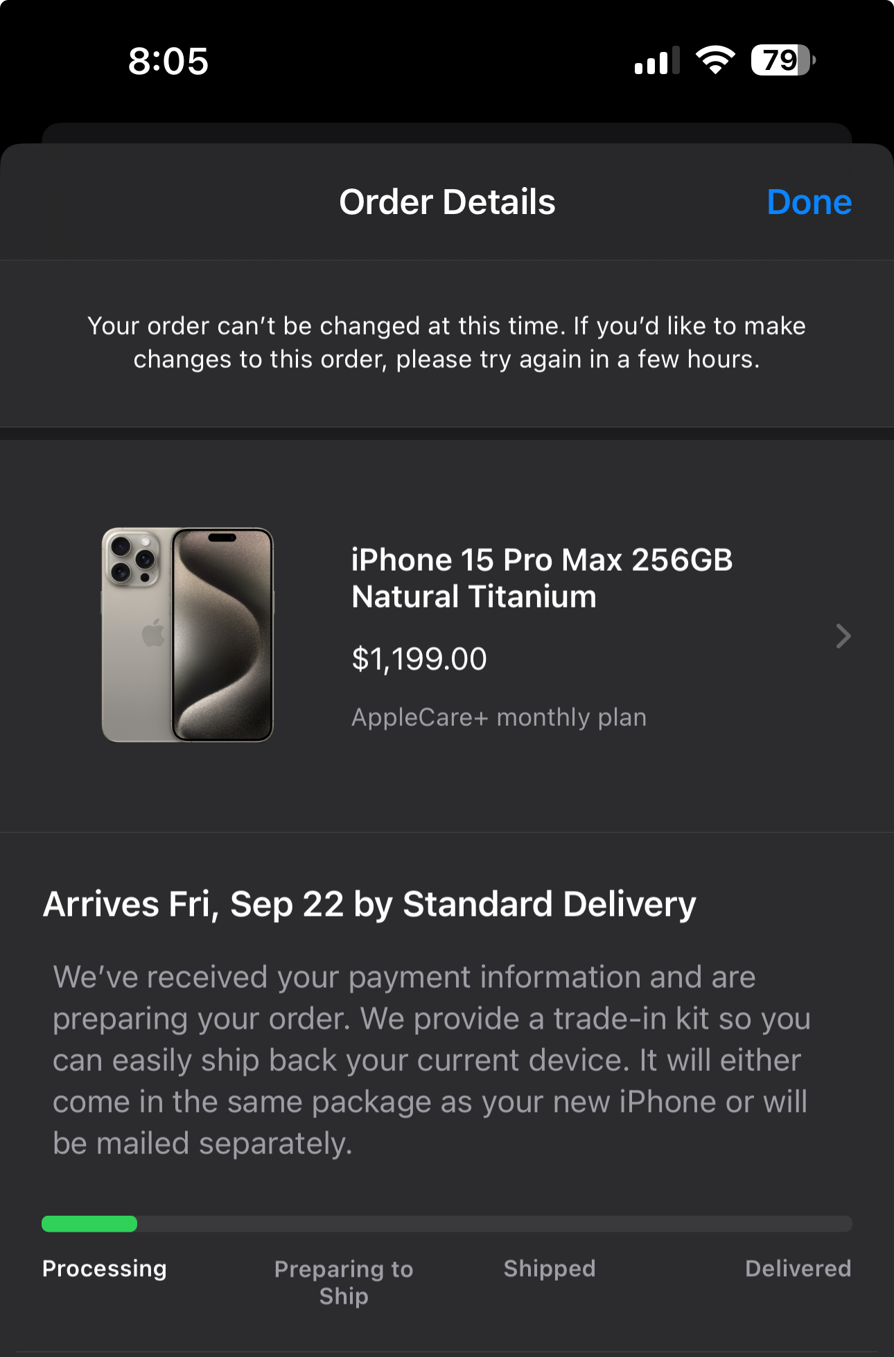 Wow, fastest checkout ever on the Apple app. Last year the app was delayed opening just a little bit. This time, opened by 7:02 CST for me, had the order saved, and checked out immediately. Seamless process. Can't wait til it ships. And so the tracking fun begins!! LETS GO!!
