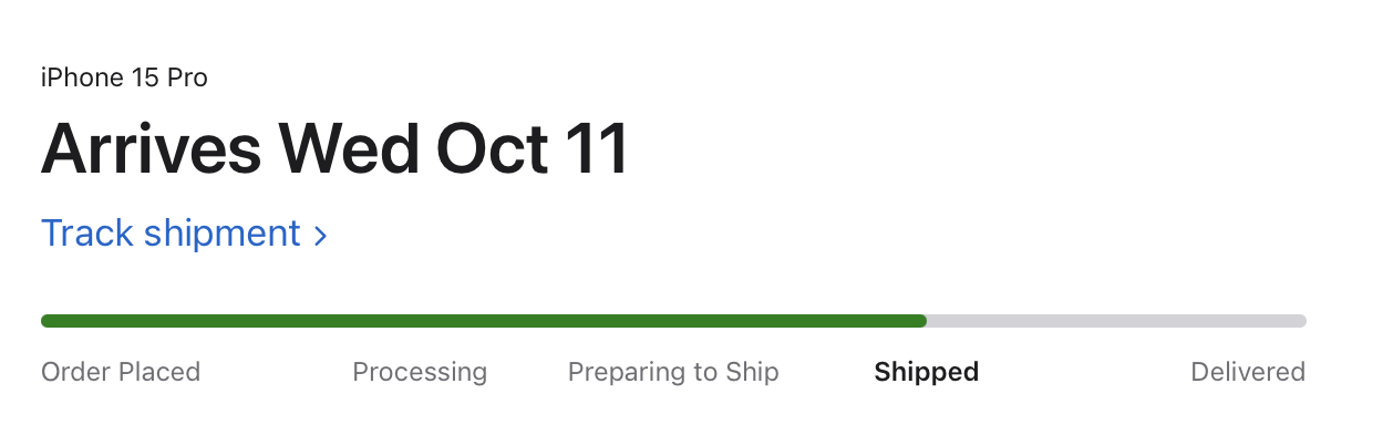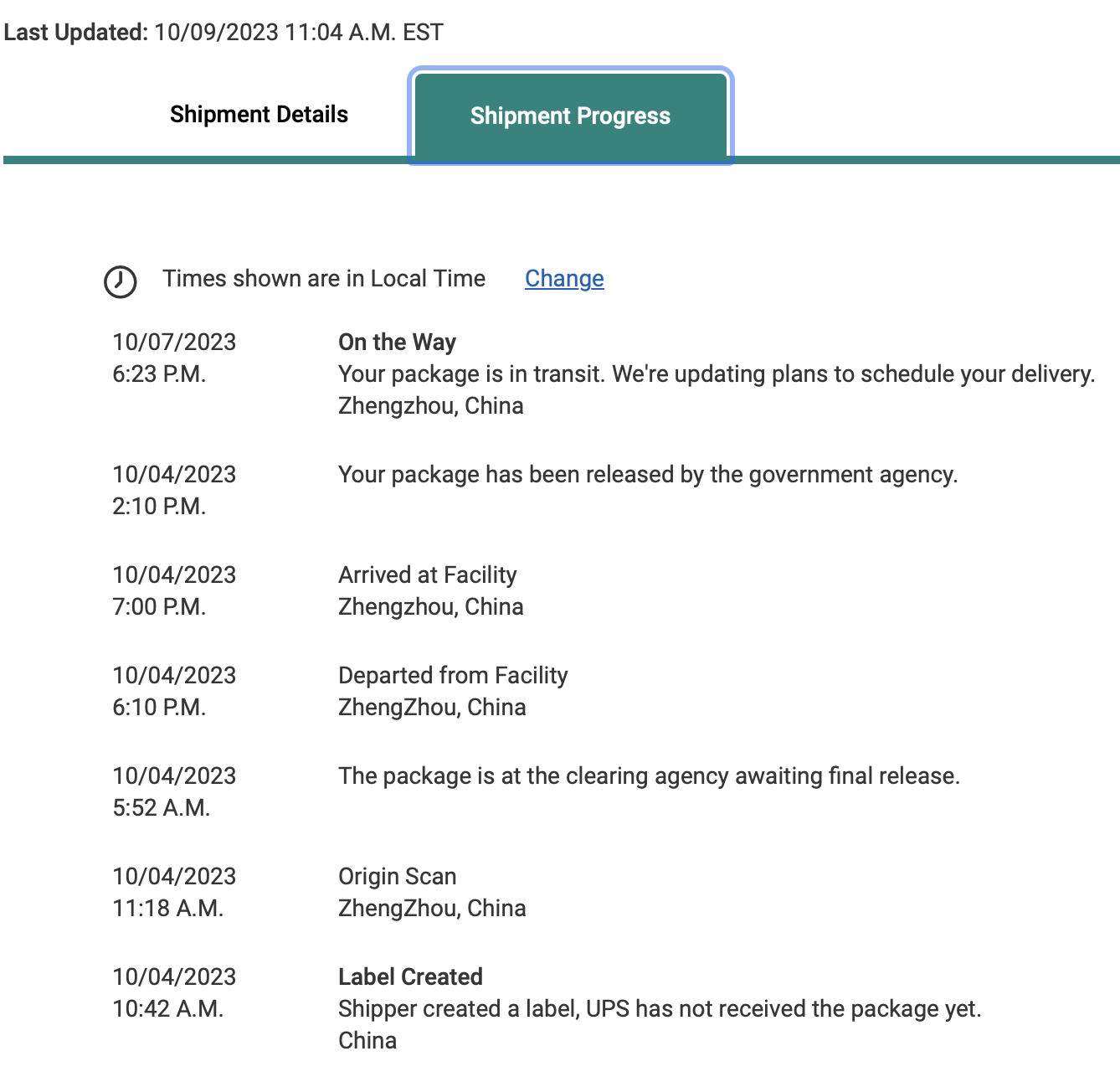 I'm in the same container as you all. I ordered the 15P NT w/256 storage on 9/16. Apple's been showing Oct 11 as the arrival date since shipment. UPS...well, I'm not even sure where the thing is. The last update at 6:23 PM on Oct 7 showed Zhengzhou as the location, so not even sure they've left there yet. I wish UPS would find the thing and give us some usable info.