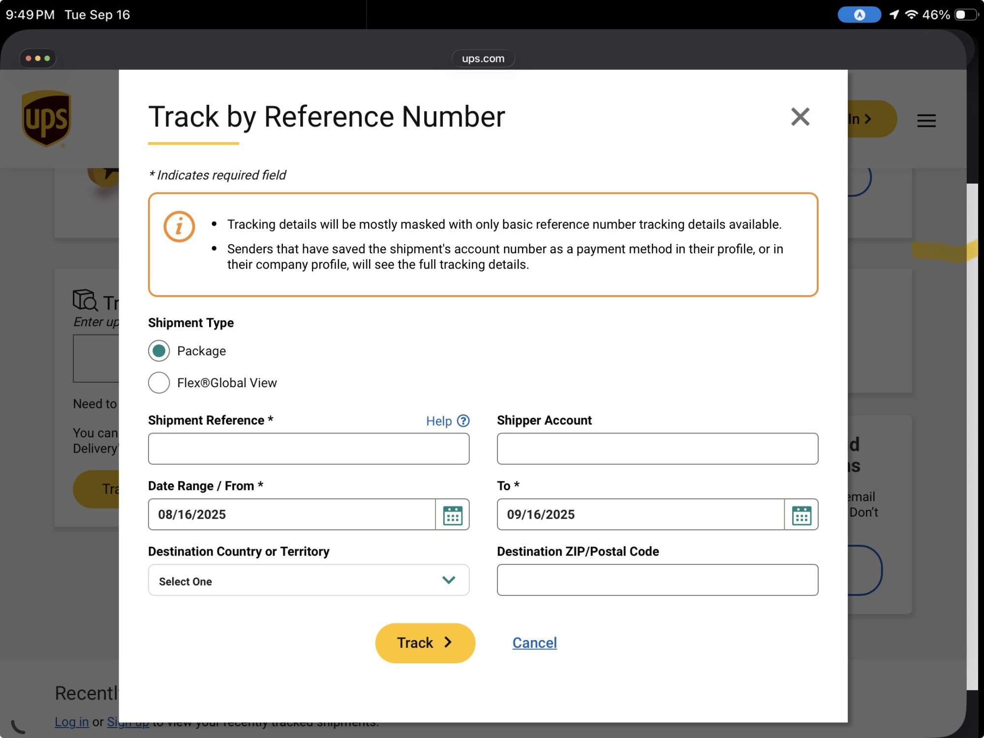 https://www.ups.com/track?loc=en_US&requester=QUIC/ - Go toI don't have a State option. Only country or territory. Entering my whole order # only returns a message that shipment reference is required.