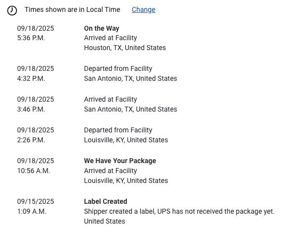 My UPS just updated, phone is in KY now. Next flight out to Los Angeles is at 3:35am