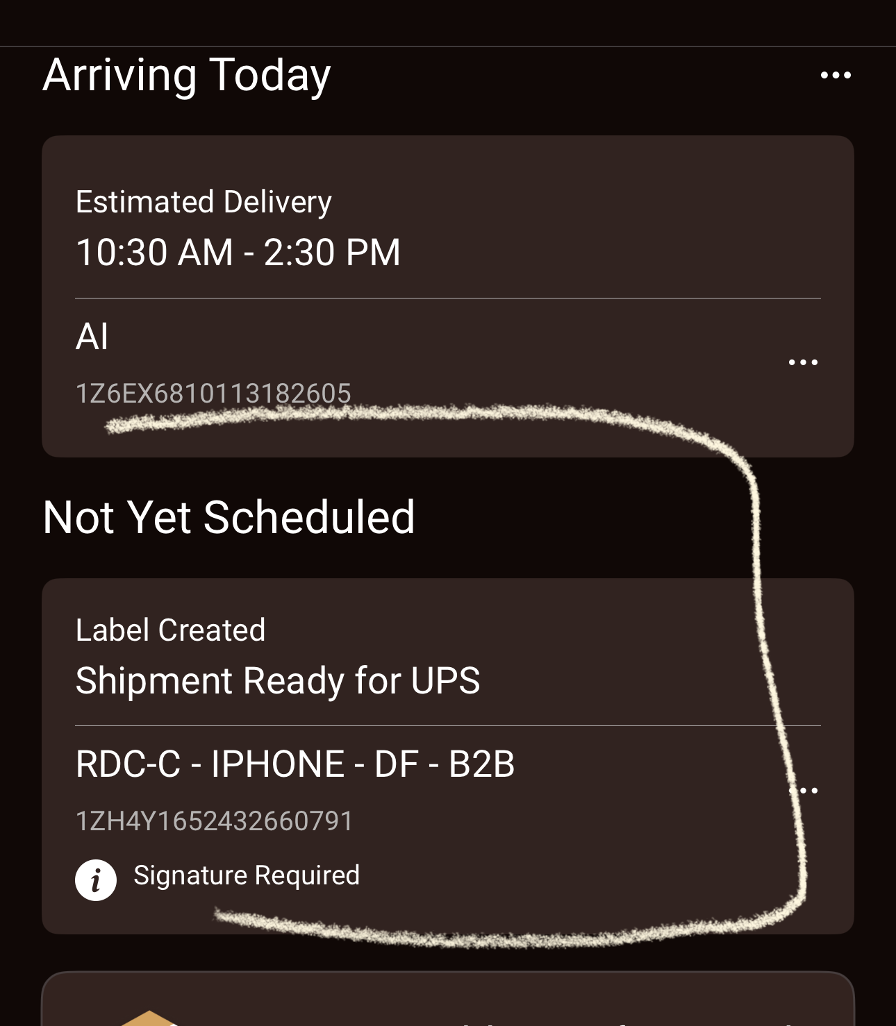 Minutes ago, I got another email from Apple, saying my order had shipped and would deliver 9/22. I tapped the tracking number which took me to the Apple Store order page, also saying delivery 9/22. When I tap the tracking number there to review on UPS, the tracking says the label was created a few hours ago and that UPS still does not have possession of my phone.