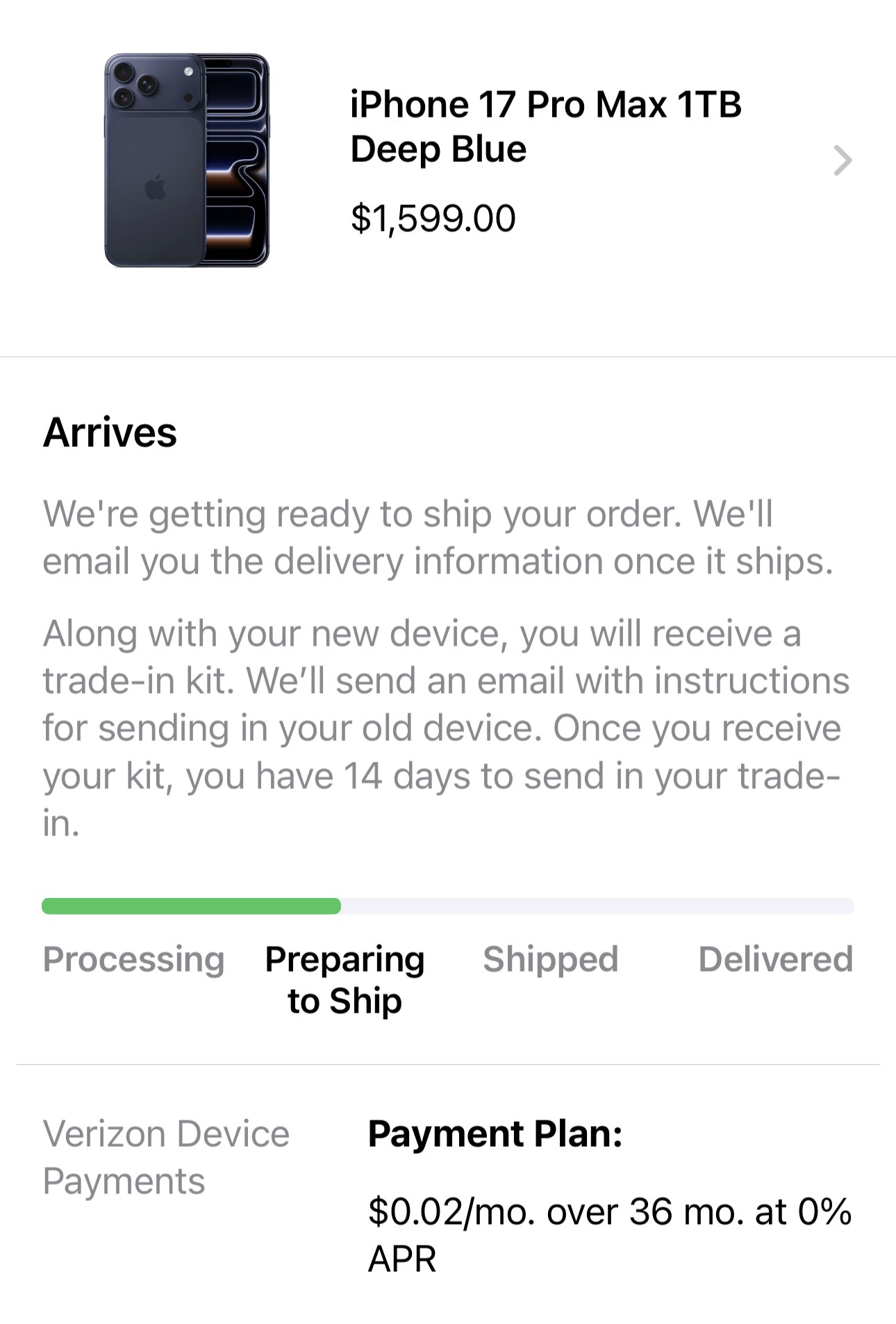 It's not looking good for me. My 17PM is still stuck in preparing to ship with disappearing arrival date since last night. No updates, no emails, no tracking. The charge for taxes and downpayment which initially posted on Tuesday is still in pending status. The option to cancel the order is no longer available. I'm afraid my delivery is getting pushed to October 😬 I'm one of those who ordered thru Apple within minutes of pre-order opening that got 9/25 then changed to 9/19. Now I don't even have a date😠