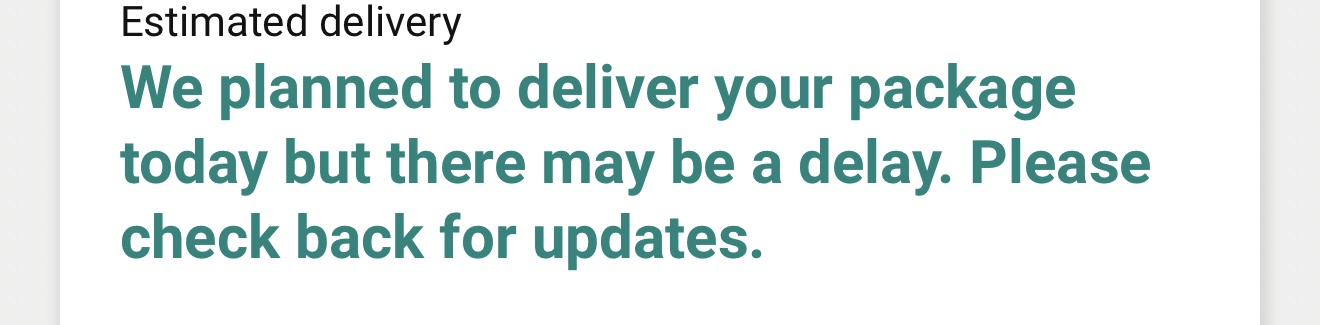 Got the same message in Rome, Ga. Think UPS is having problems this yearSo, just to give you an update… here in Puerto Rico we’re all seeing that message. Obviously, it can be “a little scary” or make us nervous, but personally I think it’s just a glitch since everyone is getting it. Still, we’re keeping an eye on things to see what happens throughout the day.View attachment 2553129