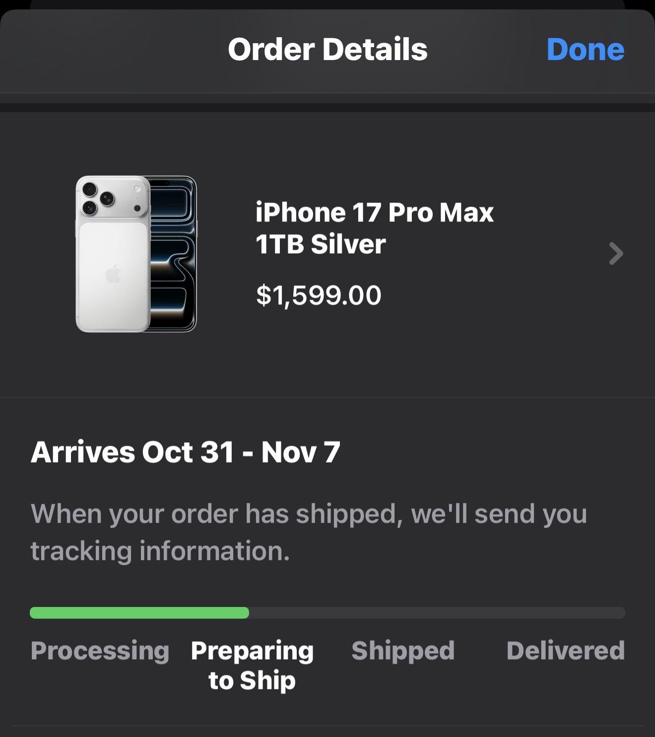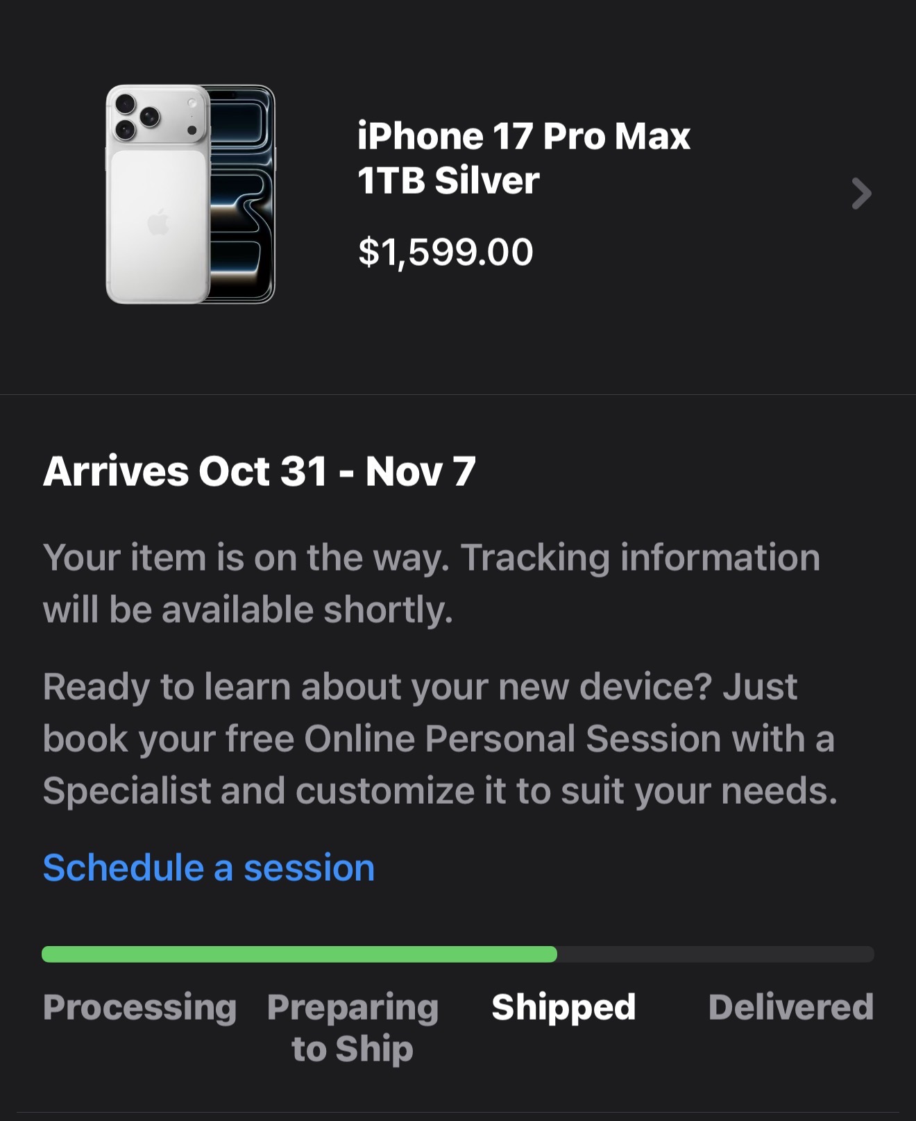 Congrats, but has Apple stopped doing next-day delivery? In the past, I'd expect this to arrive either tomorrow or Wednesday, not Friday and later.View attachment 2573137