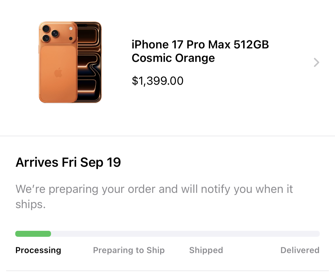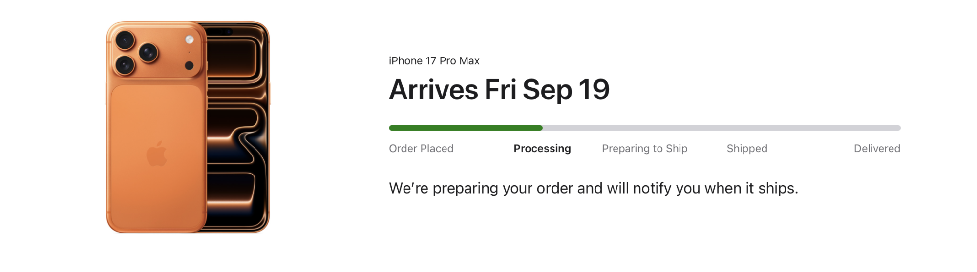 Late to join this thread, but I preordered a cosmic orange 17 pro max at 8:01 and got a 9/25 delivery date. Hopefully it bumps up to 9/19!