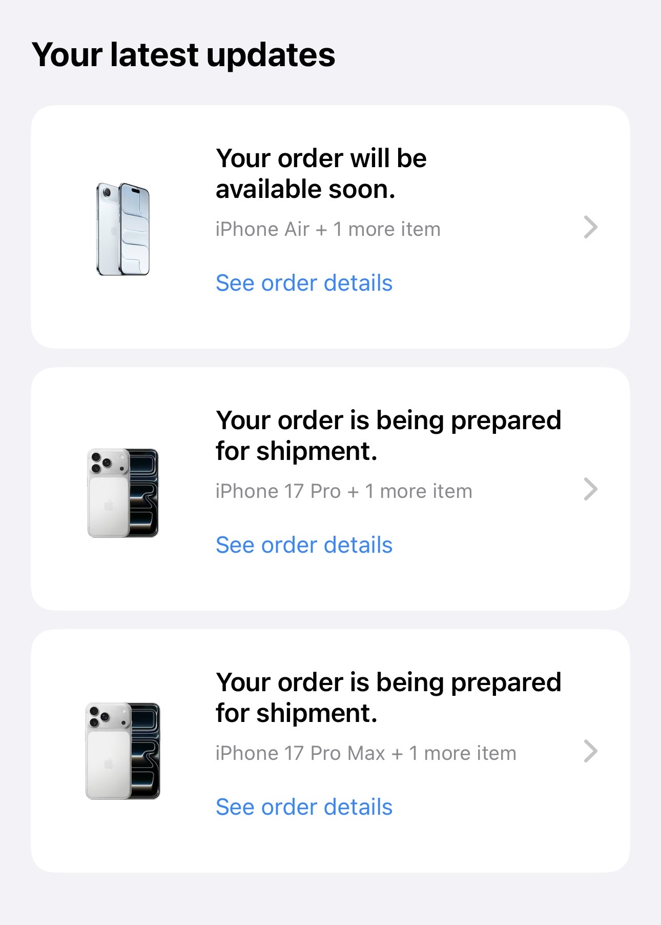 The only model backdated even on Apple's site is the Pro max. So either the demand was less across the board or they were prepared for massive preorders and had enough phones this time. I know alot of people who got the Air including myself and I think every YouTuber got one from what I see on social media... The Air is also a standalone product (as Tim Cook even confirmed on CNBC yesterday, it's the future iPhone now), so it can't go the way of the mini or Plus models.Just checked the Verizon app and almost 12 hours later, every color in every storage option is STILL available. The Air gonna go the way of the mini and plus models lol