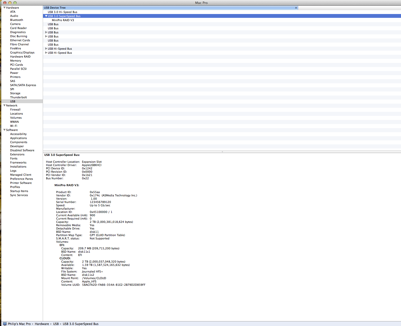 Although it says the speed is 5Gb/sec, wouldn't that max out at 625mb/s, which the raid exceeds? I'm assuming if I added more SSD's to the raid it would be faster than the ~750 I'm getting. Not sure though.Can you click on USB on the left pane and then show us the Device Tree on the right pane. Then choose the USB Bus belonging to the card so that we can see which Host Controller Driver it is using.