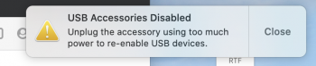 I bought a WD my passport for mac and tried to use it with my macbook pro running 10.15.6 Catalina. A message popped up that said USB accessories disabled.