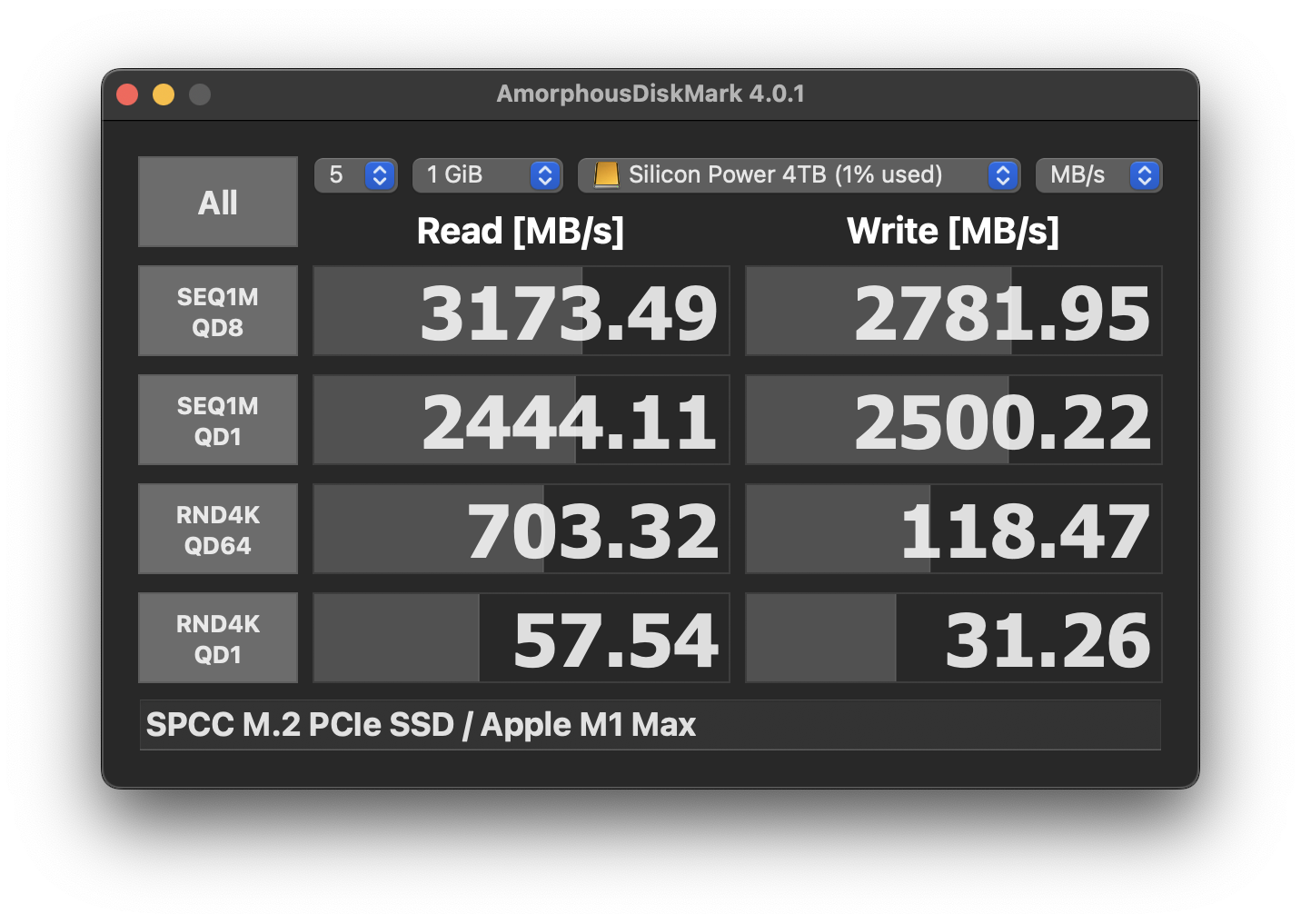 Interesting. I think there's a problem with AmorphousDiskMark and WD 850X 4TB. I get the same low write results.I passed on the HyperDrive and bought an Acasis instead. I put in a Silicon Power 4TB SSD. Here's the DiskMark test with my MBP M1 Max. It's definitely the fastest drive I have by a long shot. It even beat my WD Black 4TB drive in a Konyead enclosure.