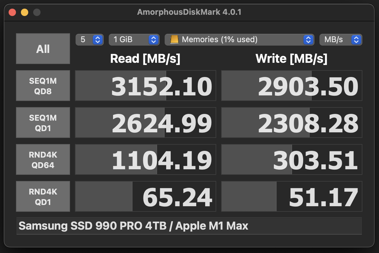 Unfortunately, I failed to test the WD Black with Blackmagic, and now it’s used as a Carbon Copy Cloner disk so it’s set to read-only. 🤔Interesting. I think there's a problem with AmorphousDiskMark and WD 850X 4TB. I get the same low write results.